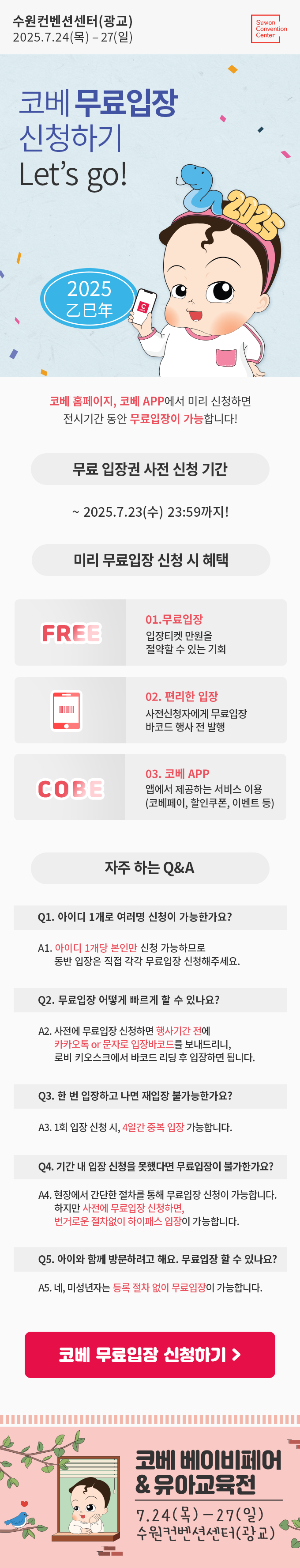 바로 2025 수원 코베 베이비페어&유아교육전이 7월 24일(목)부터 27일(일)까지 수원컨벤션센터에서 개최된다는 소식인데요. 무료입장 신청만 하면 4일간 프리패스 입장이 가능하다고 해서 미리 소식 공유드려요 😊